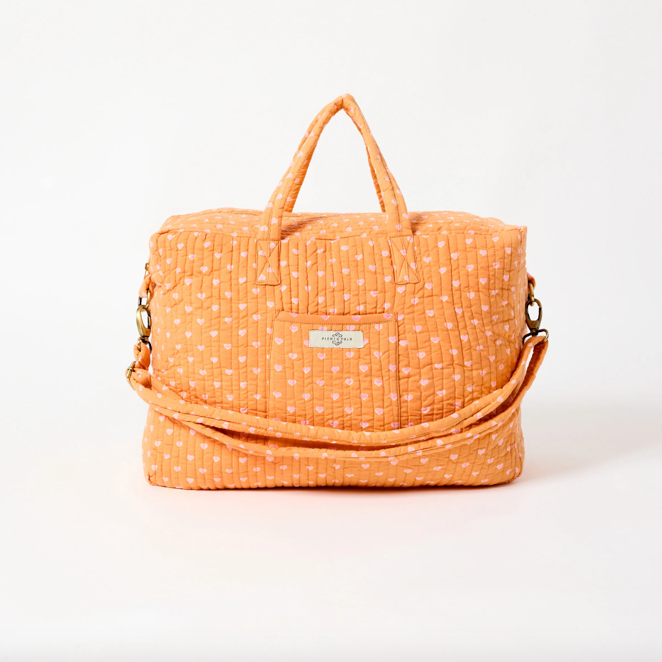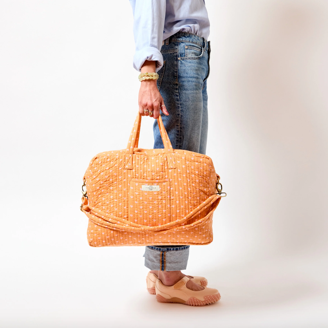 The ideal companion for weekend getaways, our quilted overnight/weekend bag is both practical and playful. Crafted with our signature block-printed fabrics and adorned with gold hardware, this stylish bag is designed to hold all your essentials.