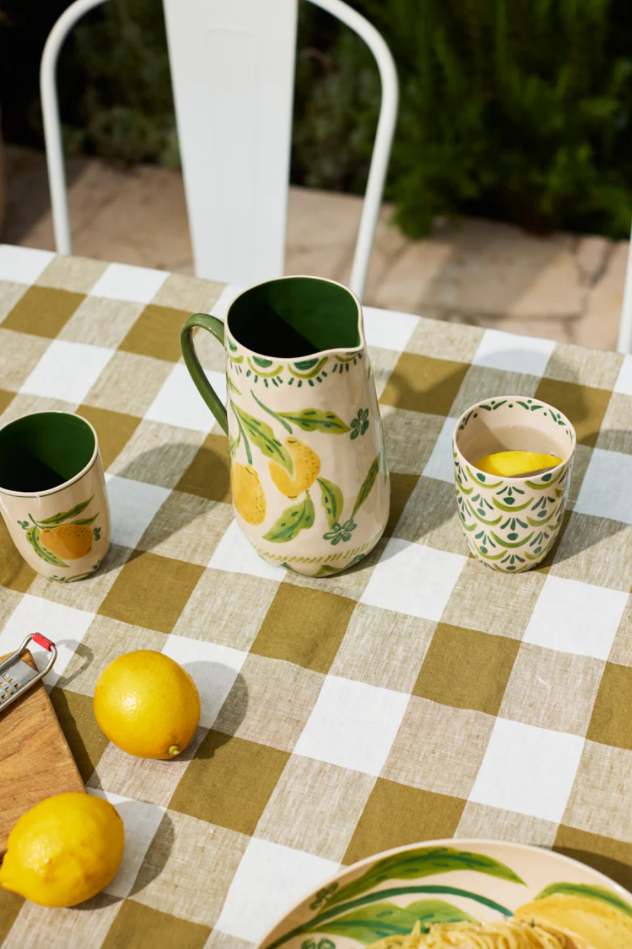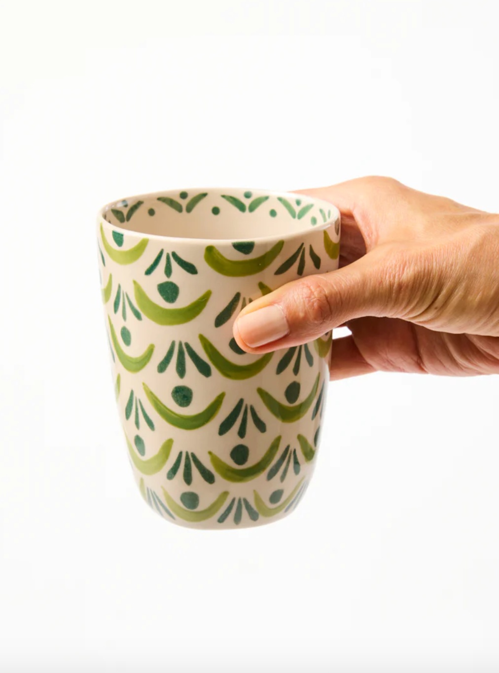 Delicate patterns reminiscent of Mediterranean gardens encircle this artisan-crafted cup, its geometric precision balancing the organic forms of nature. Hand-painted in our distinctive green and white palette, each sip becomes a sensory journey the cup's substantial size making it perfect for coffee and tea or spritzes and cocktails.