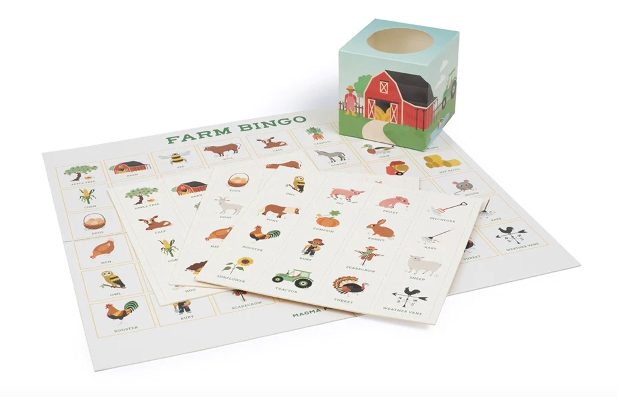 Beautifully packaged, Farm Bingo is gorgeously illustrated by award-winning illustrator Caroline Selmes the game also includes a booklet with all the things you wanted to know about farm animals. From the farmer, the scarecrow and the tractor to the pigs, chickens, cows and ducks, along with classic crops like sunflowers, corn and pumpkins, Farm Bingo has it all!