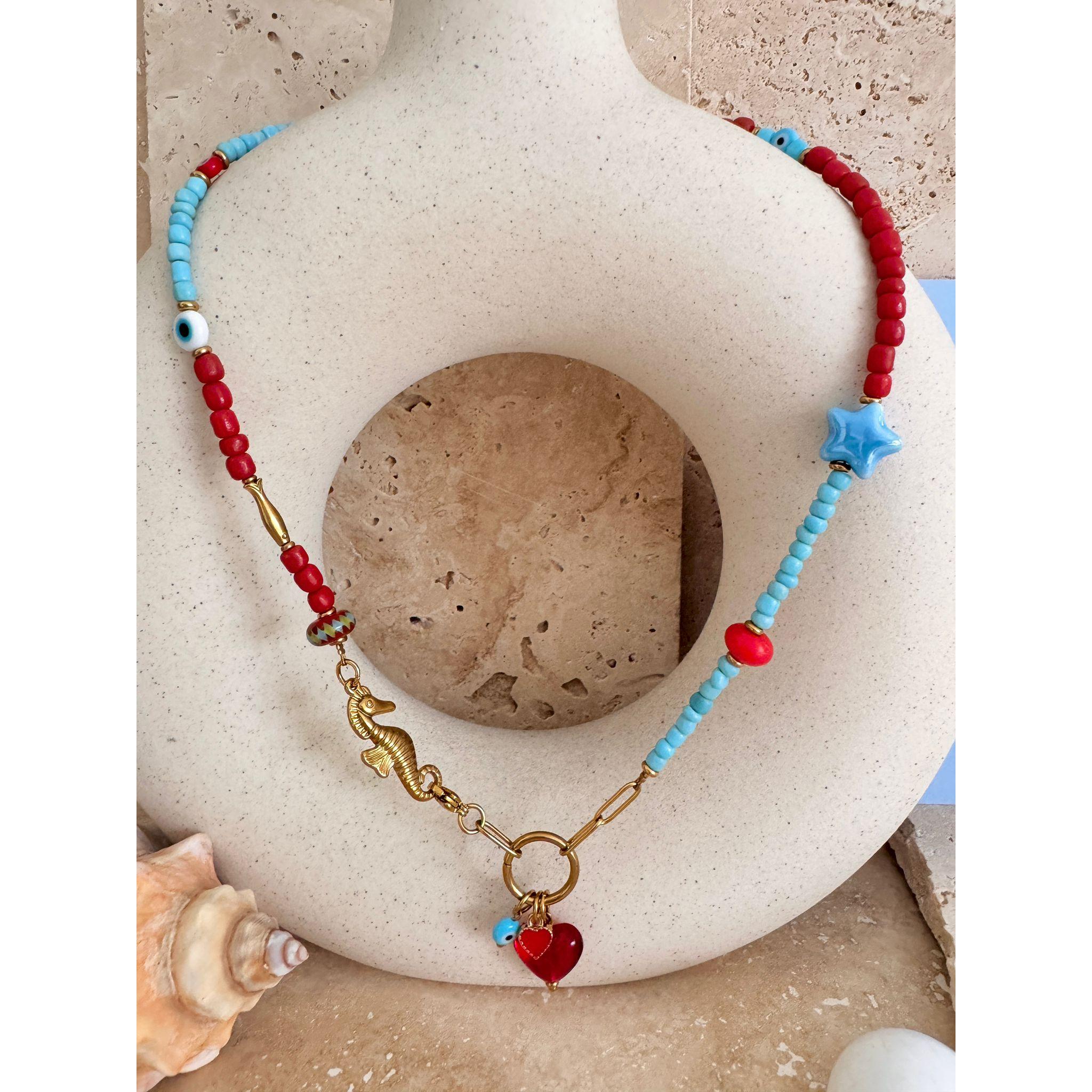 Turn up the summer fun with our Unserious Jewellery Range, designed to match perfectly with our Unserious tees. Bursting with personality, this vibrant jewellery duo features a playful mix of funky fish beads, chunky Greek-blue stars, and bright red accents that feel like sunshine, salt water and good energy.