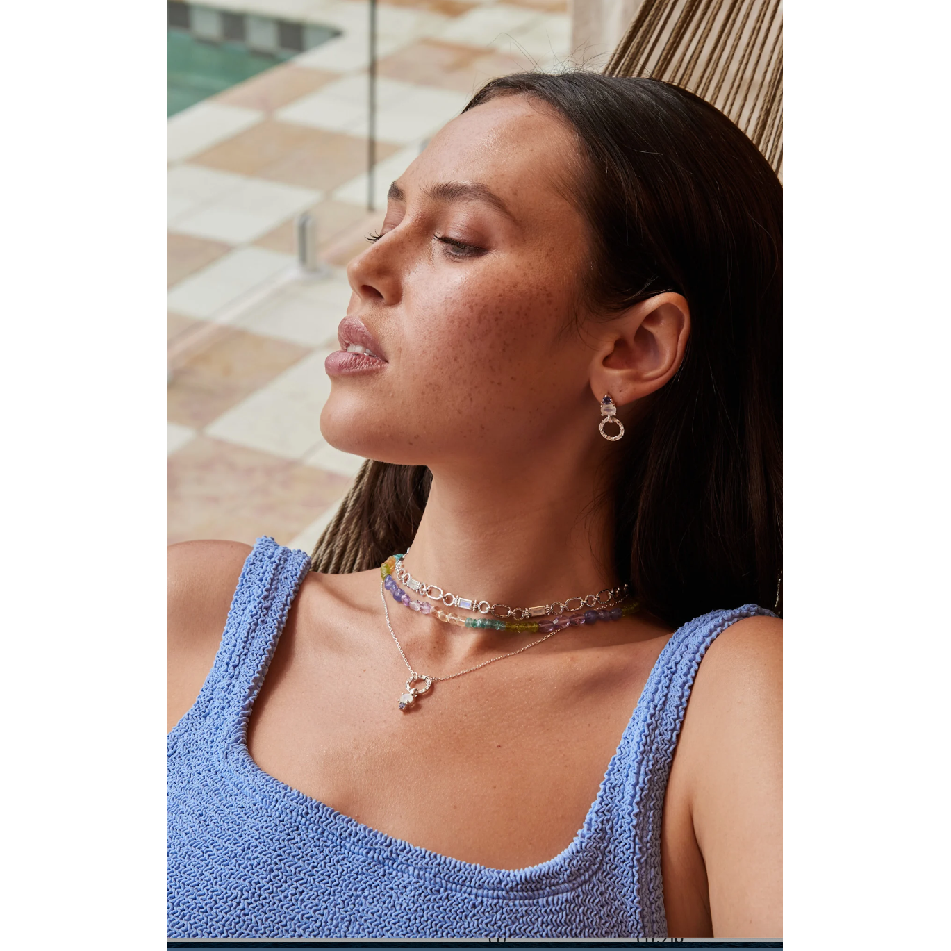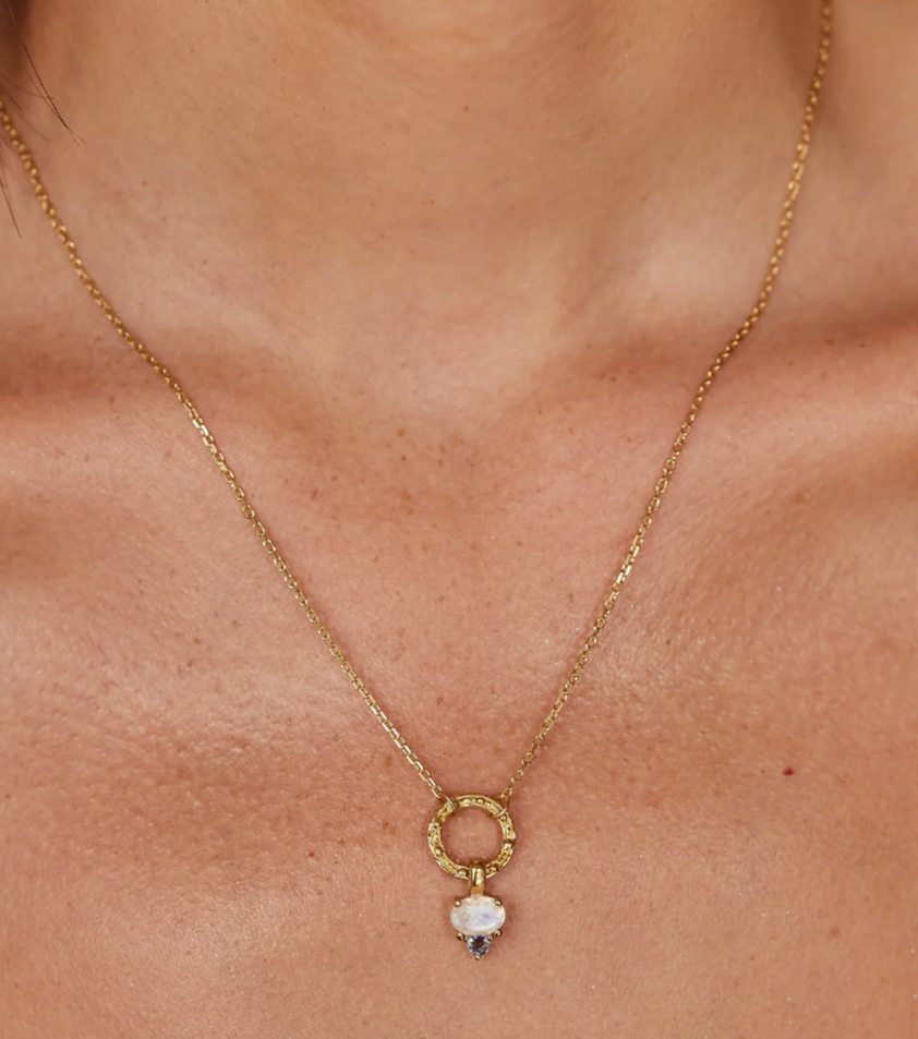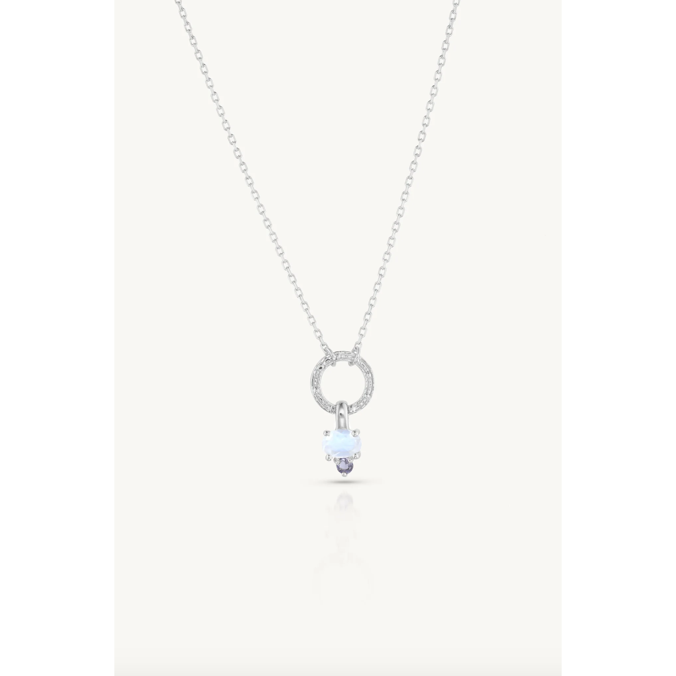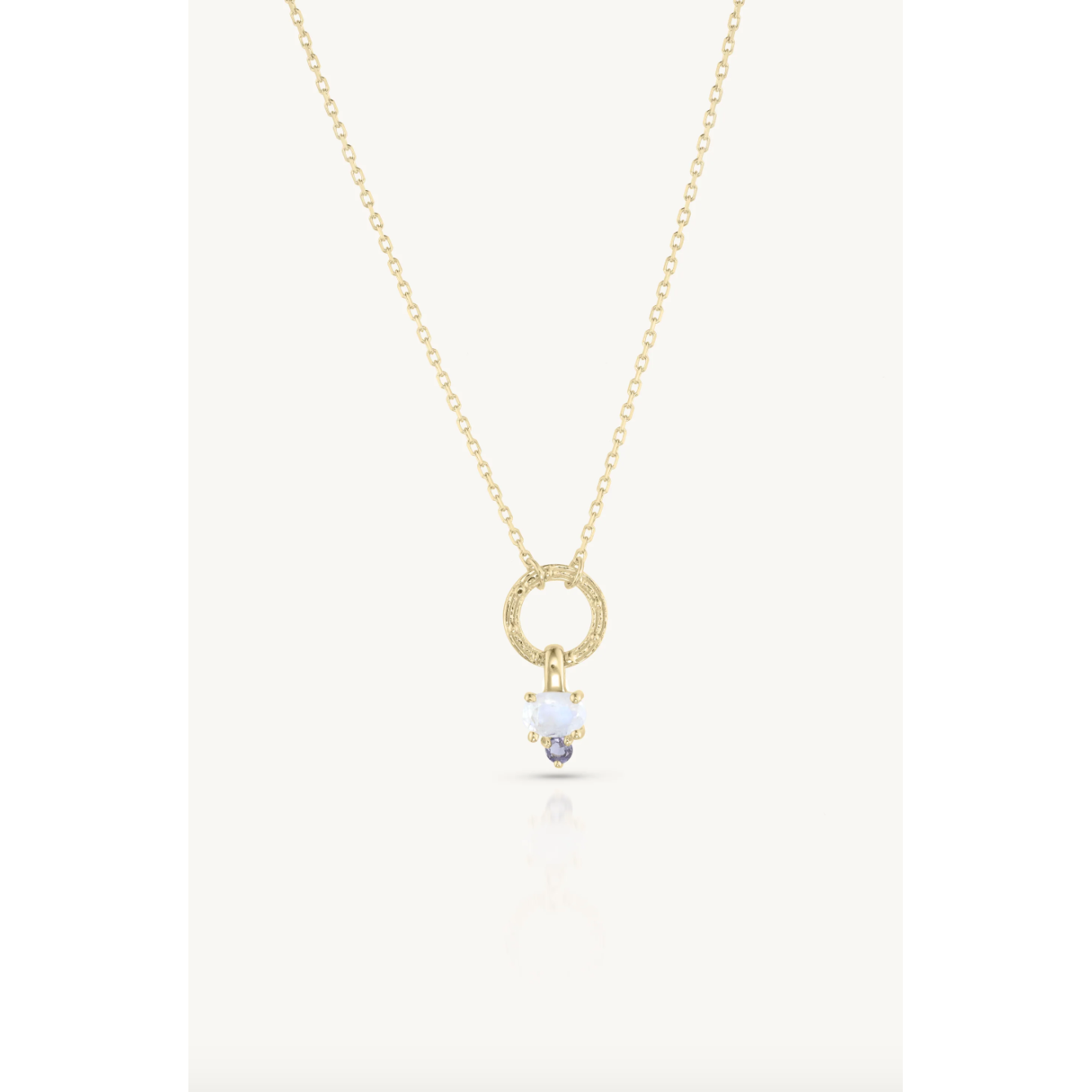 Featuring a luminous Moonstone and Iolite suspended from a textured ring, detailed with fine line and dotwork for a beautifully crafted piece.