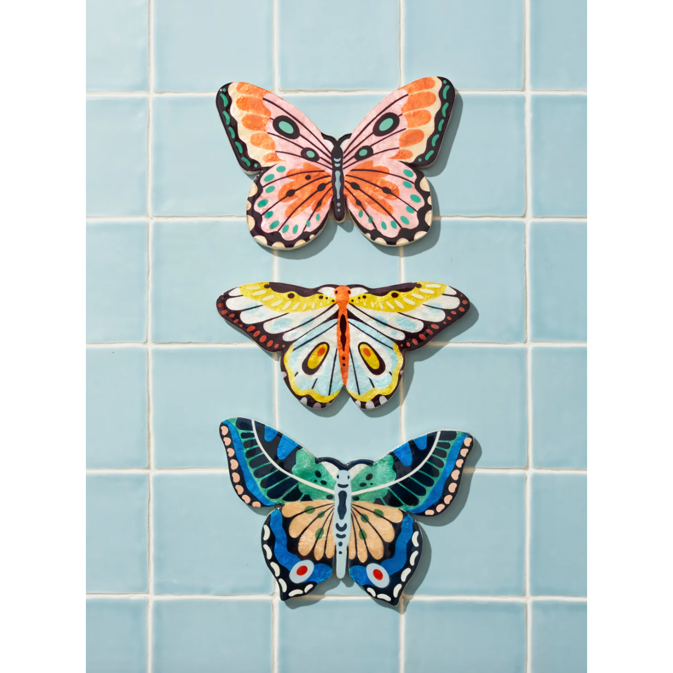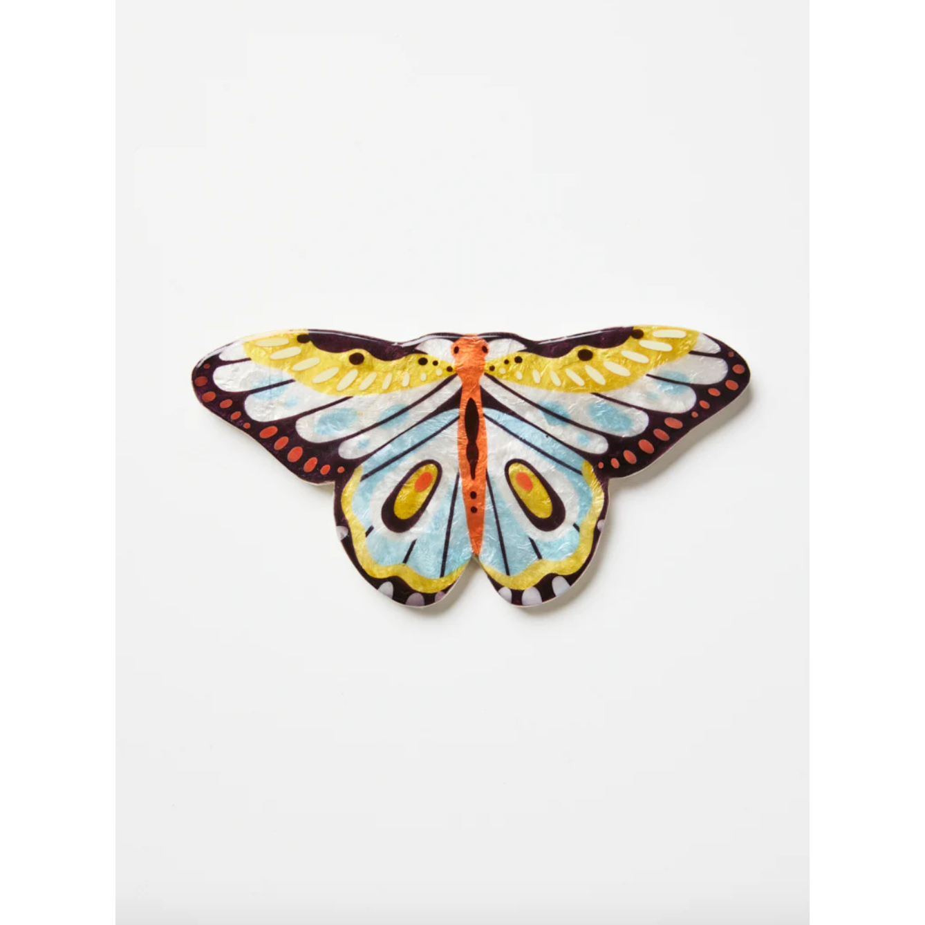Like sunshine in butterfly form. With cheerful pops of yellow, coral and sky blue, this yellow butterfly wall decor is cut from glowing capiz shell and handpainted to perfection. A bright idea for bedrooms, playrooms or anywhere that needs a lift. We love it paired with the other Canopy butterflies in a little grouping on the wall.