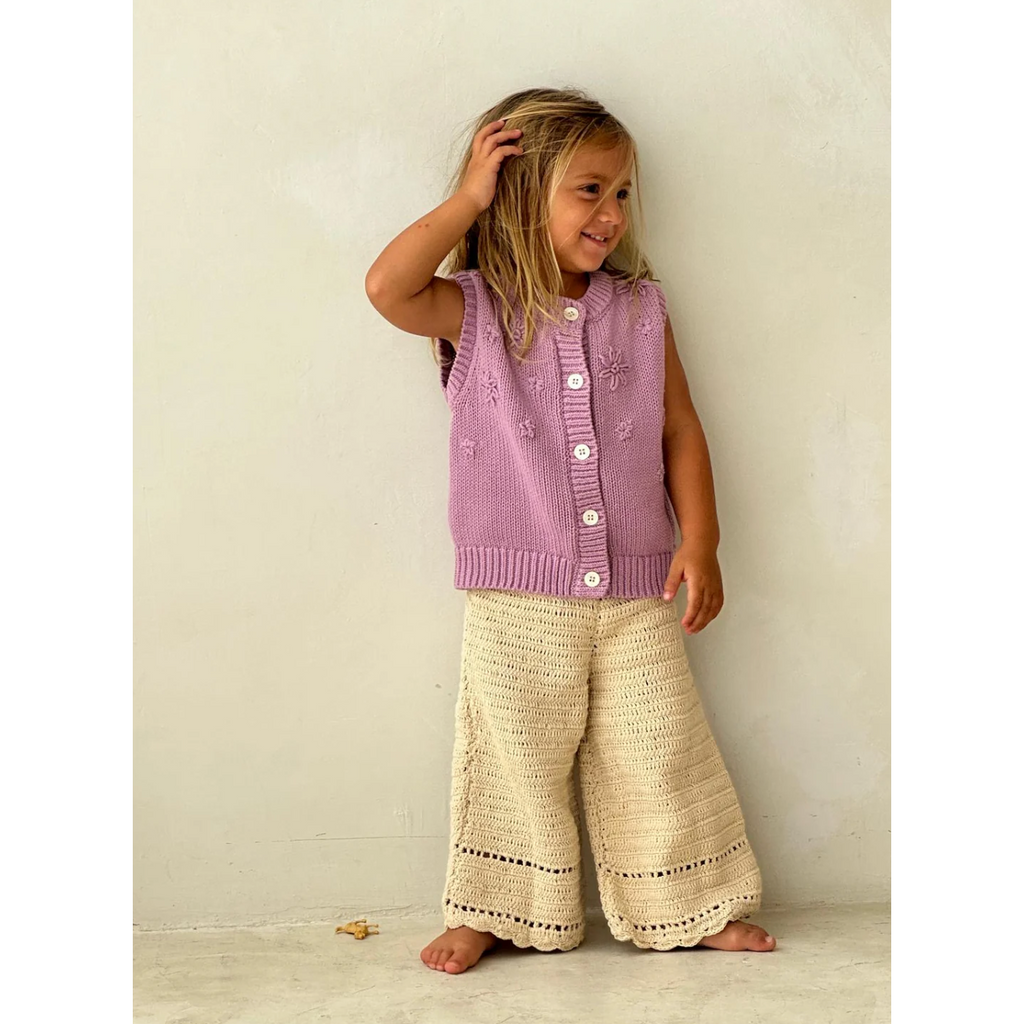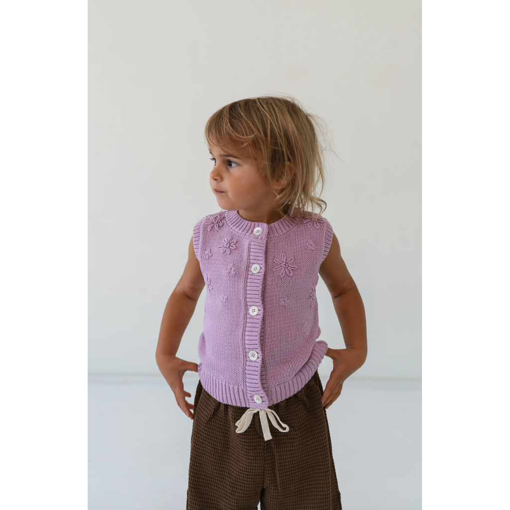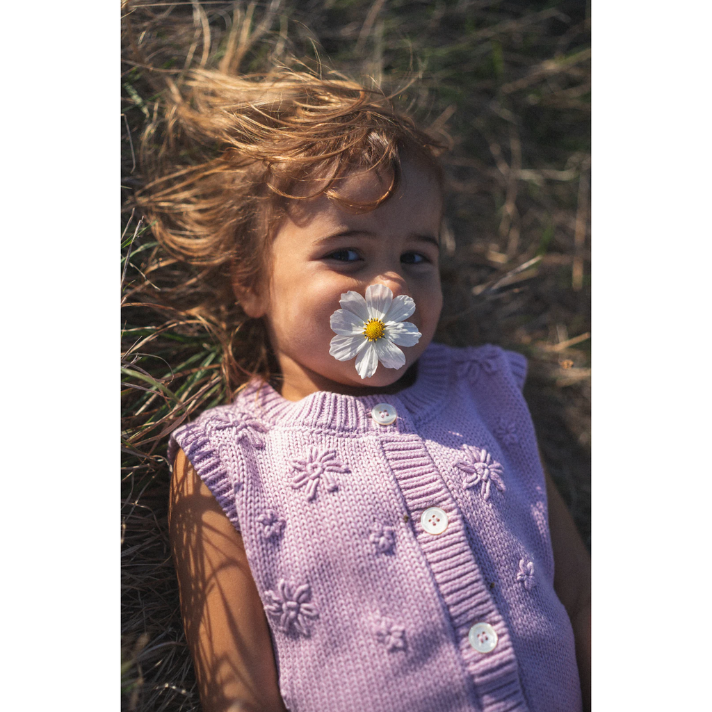 The Floral Knit Vest is a cosy-meets-cute layering piece, crafted from 100% organic cotton in our dreamy Mauve hue. Delicate hand-stitched floral detailing adds a sweet, nostalgic touch, while buttons down the center make for easy styling. Perfect for layering through the seasons, this timeless piece is as versatile as it is beautiful.