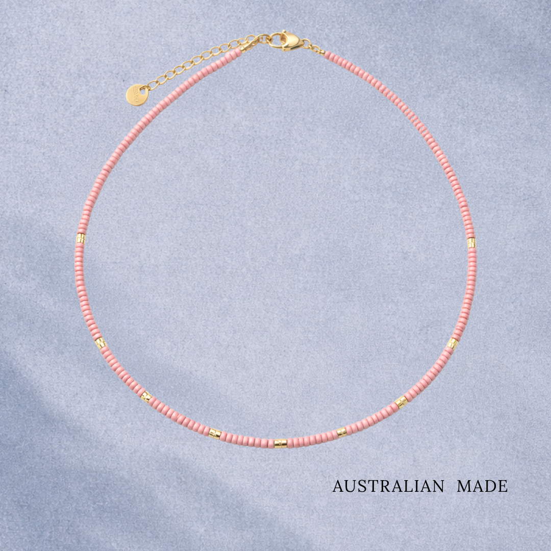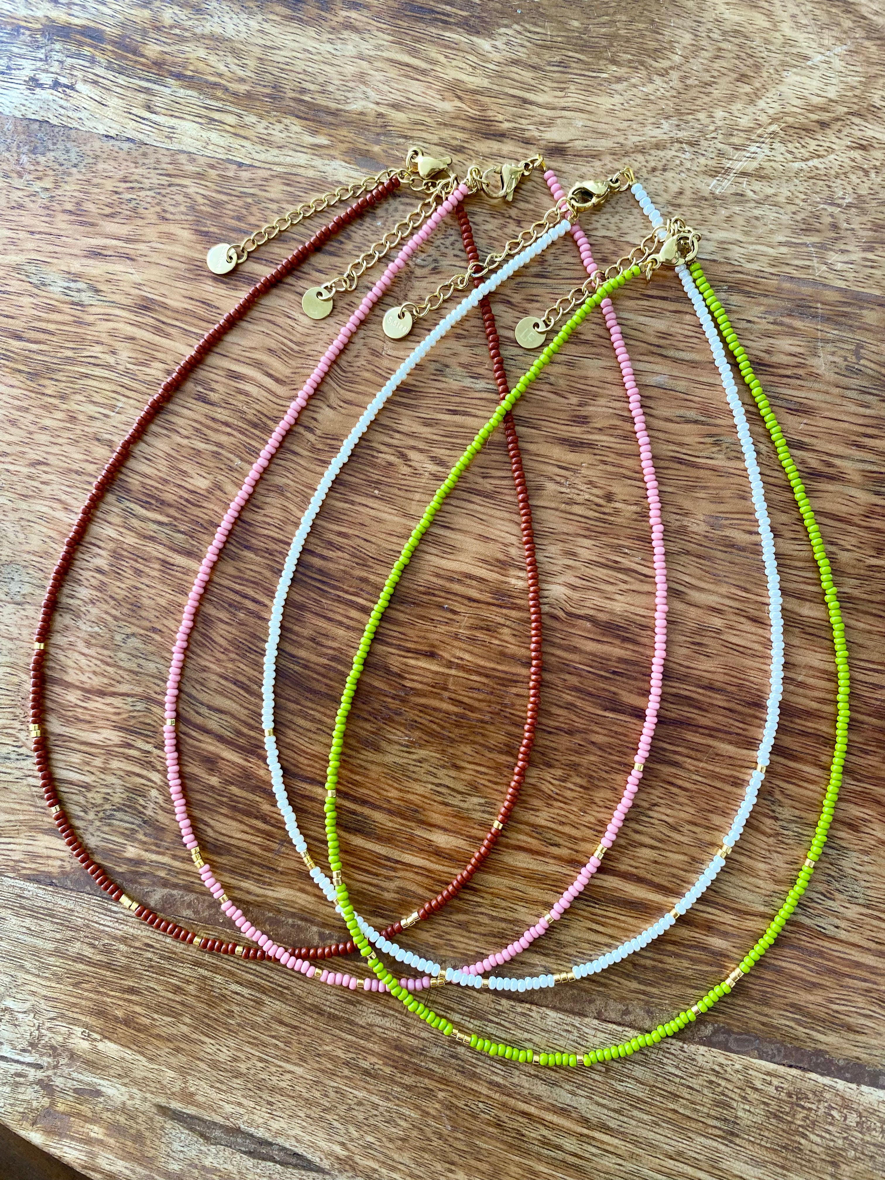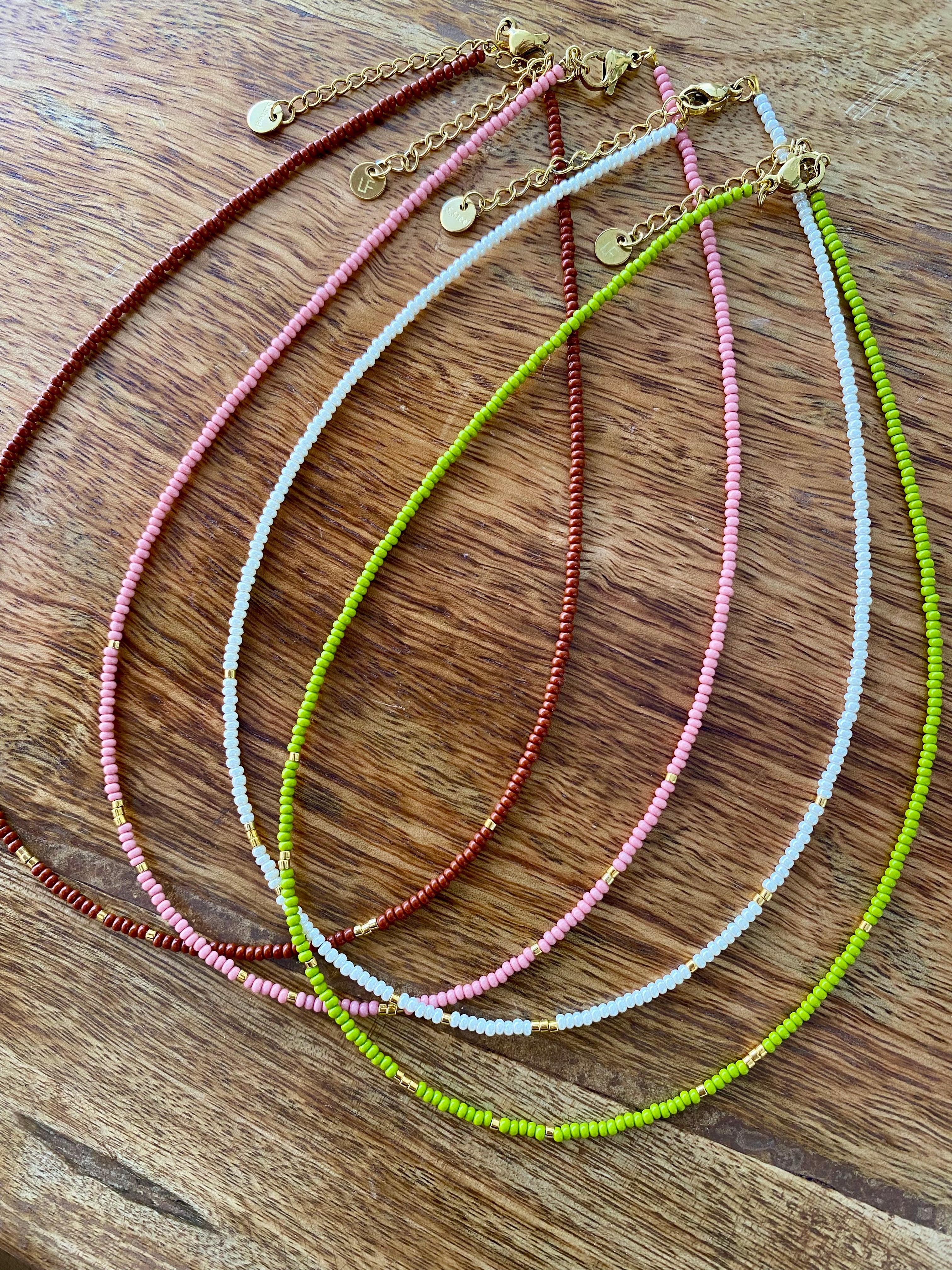 Designed to reflect the same playful yet refined colour palette matcha greens, creamy oat, soft raspberry blush and rich chocolate hues — each necklace is handcrafted with fine seed beads and finished with subtle gold accents.