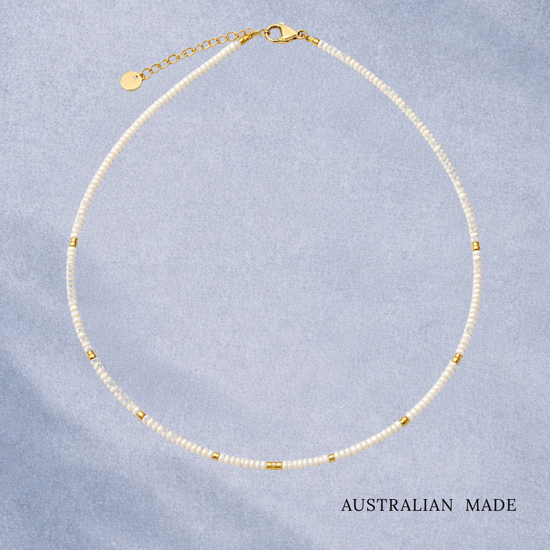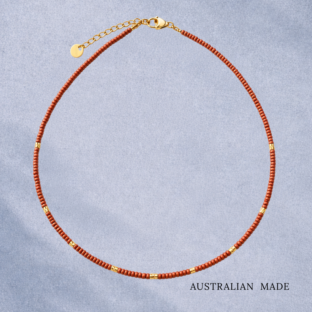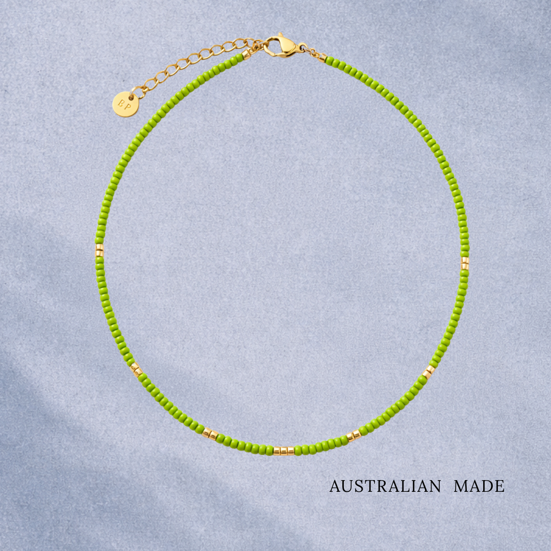 Designed to reflect the same playful yet refined colour palette matcha greens, creamy oat, soft raspberry blush and rich chocolate hues — each necklace is handcrafted with fine seed beads and finished with subtle gold accents.