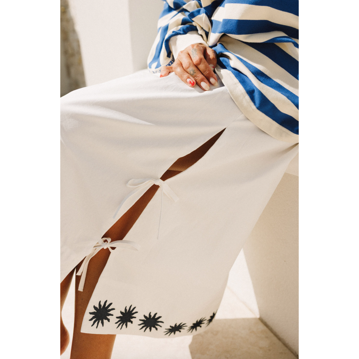 Meet the piece that's going to elevate all of your Summer get-togethers, the Sunburst Maxi Skirt in a beautiful crispy white poplin. With fine details like sunburst embroidery and side-ties, she pairs perfectly with your favourite Summer crops and oversized tees for an effortless boho vibe. Inspired by European bohemian street style.
