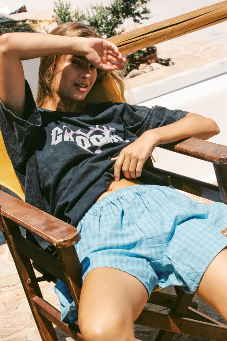 Wear them with an oversized tee, pair with the matching vacanza shirt, or throw them on after a swim. Simple, easy blue with nothing to overthink ∿